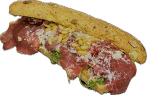 Broodje carpaccio met zongedroogde tomaat, pijnboompitten, Parmezaanse kaas, truffelmayonaise, sla en rucola.