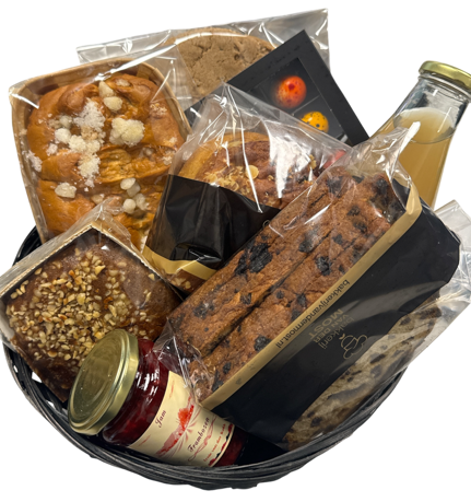 Luxe mand gevuld met: Sallandse brok, suikerbrood, coniques 9st., vechtzomp, Vechtdal sap, Sallandse krentenwegge, kruidcake met noten en jam.