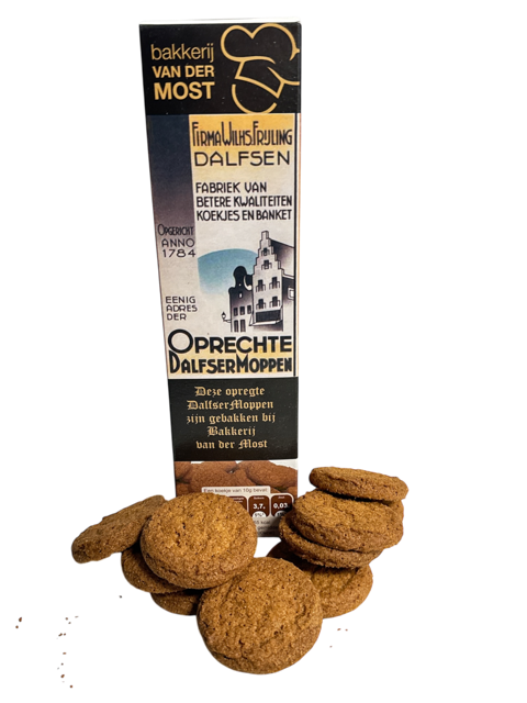 Uniek streekproduct! De originele Dalfser Mop verpakt in een authentiek doosje. Inhoud 200 gram moppen.