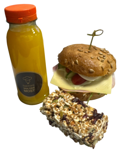 Heerlijke lunch met 1 luxe belegd broodje, 1 flesje jus d’orange 250 ml en een speltbar.