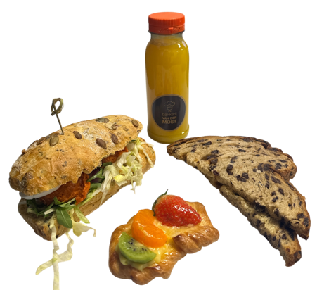 Heerlijke lunch met 1 luxe belegd broodje, 1 mini deense luxe, 1 krentenwegge besmeerd en 1 flesje jus d’orange 250 ml.