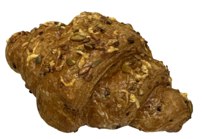 Heerlijke meergranen croissant met geraspte kaas en gebroken pompoenpitten.